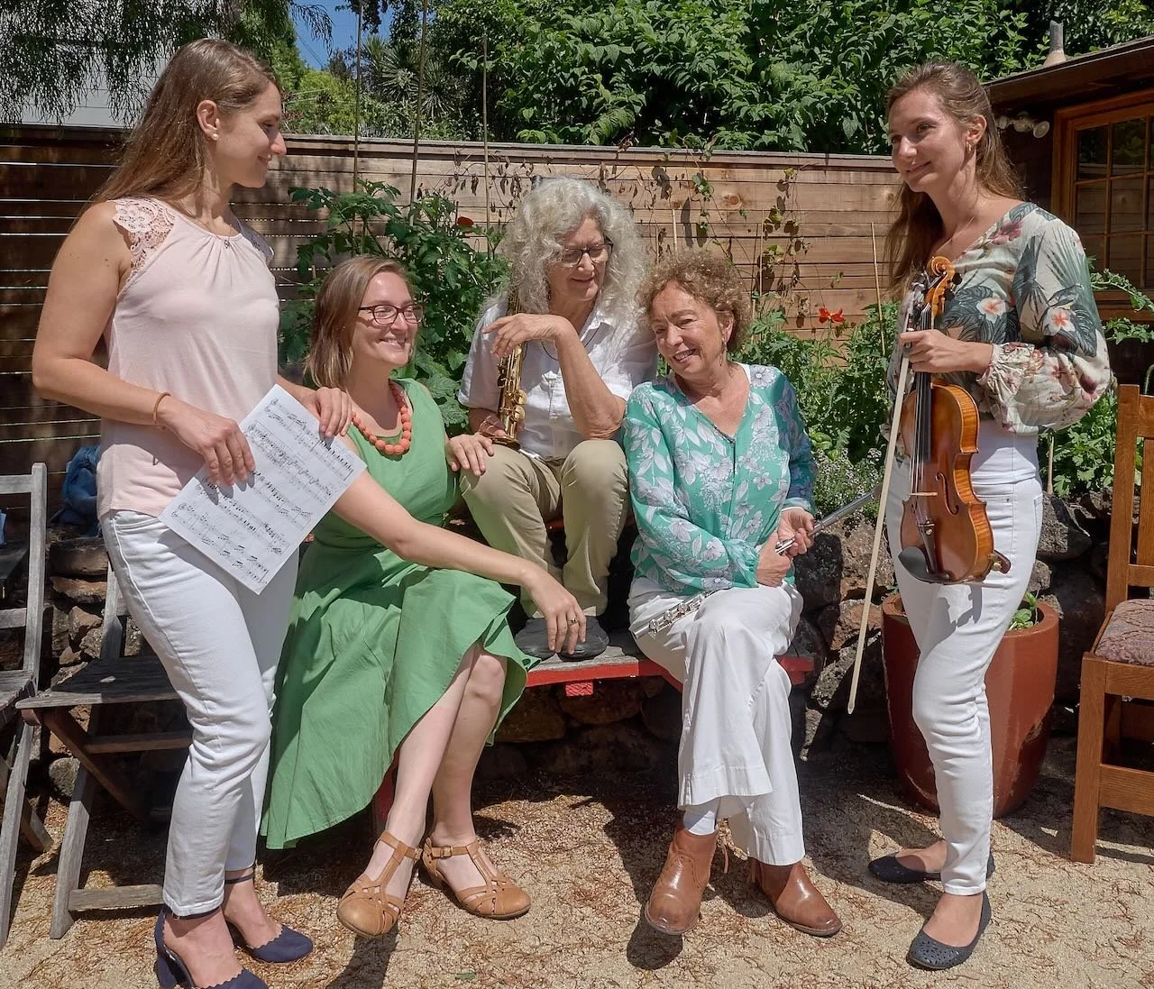 The Ensemble consists of Donna Viscuso on flute, Klaudia Promessi on soprano saxophone, Viola Pellegrini on violin, Eleonora Pellegrini on harp and Devon Thrumston on cello.